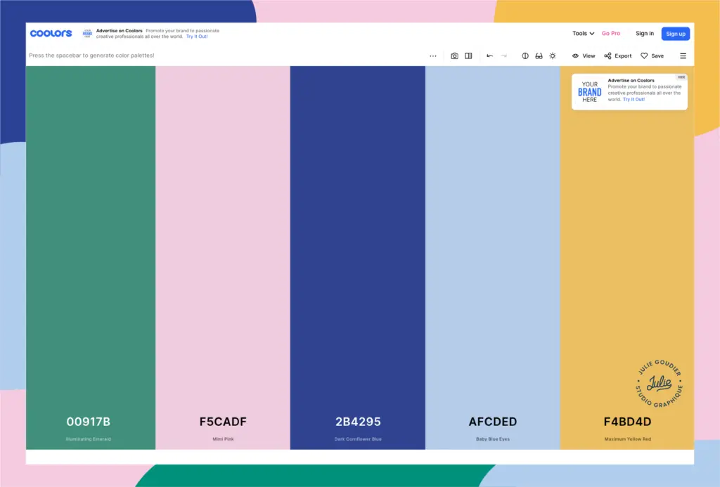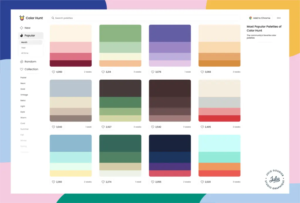 Coolors est un autre générateur de palette. Il y a même une fonction de recherche si vous avez un style, une couleur ou une ambiance en tête . En fonction de cela, le site vous propose des palettes adéquates à l’univers que vous souhaitez ! ✨