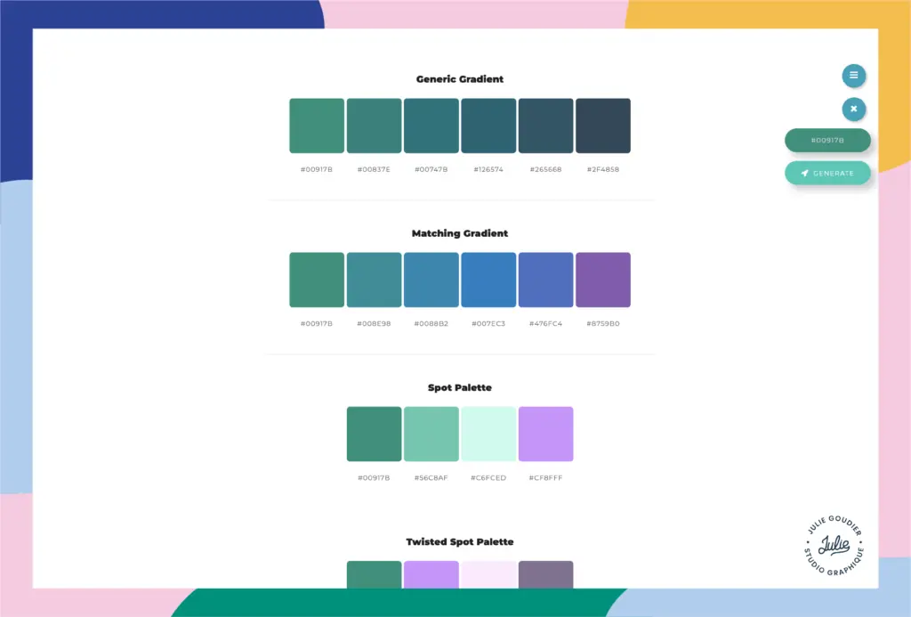 Il est basé sur le même système que Coolors, avec des palettes générées au hasard, des palettes populaires ou encore celles conçues selon une ambiance ou une couleur principale.