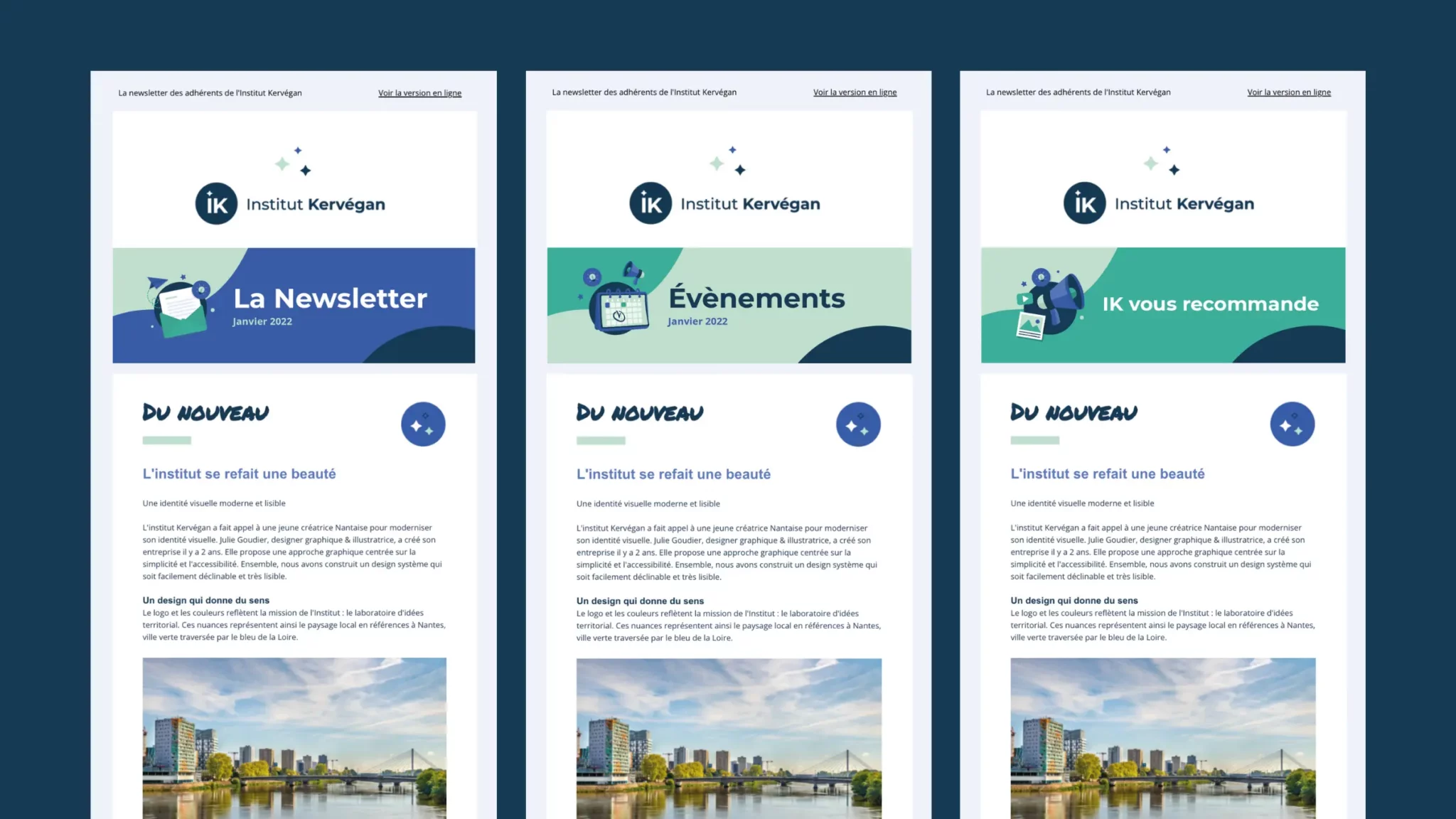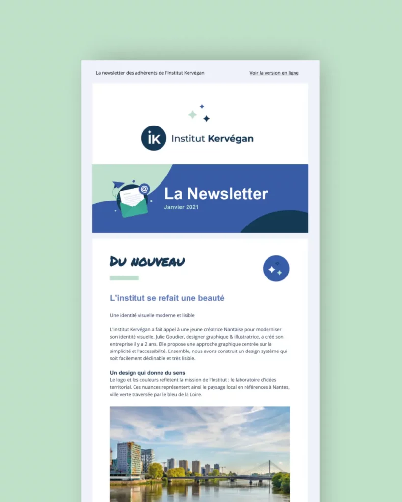 Une newsletter déclinable facilement a été conçue pour assurer une communication fluide et homogène. Développée directement sur l’outil d’emailing de l’Institut, elle propose des modèles prêts à l’emploi, permettant une diffusion rapide et efficace des actualités de l’association.