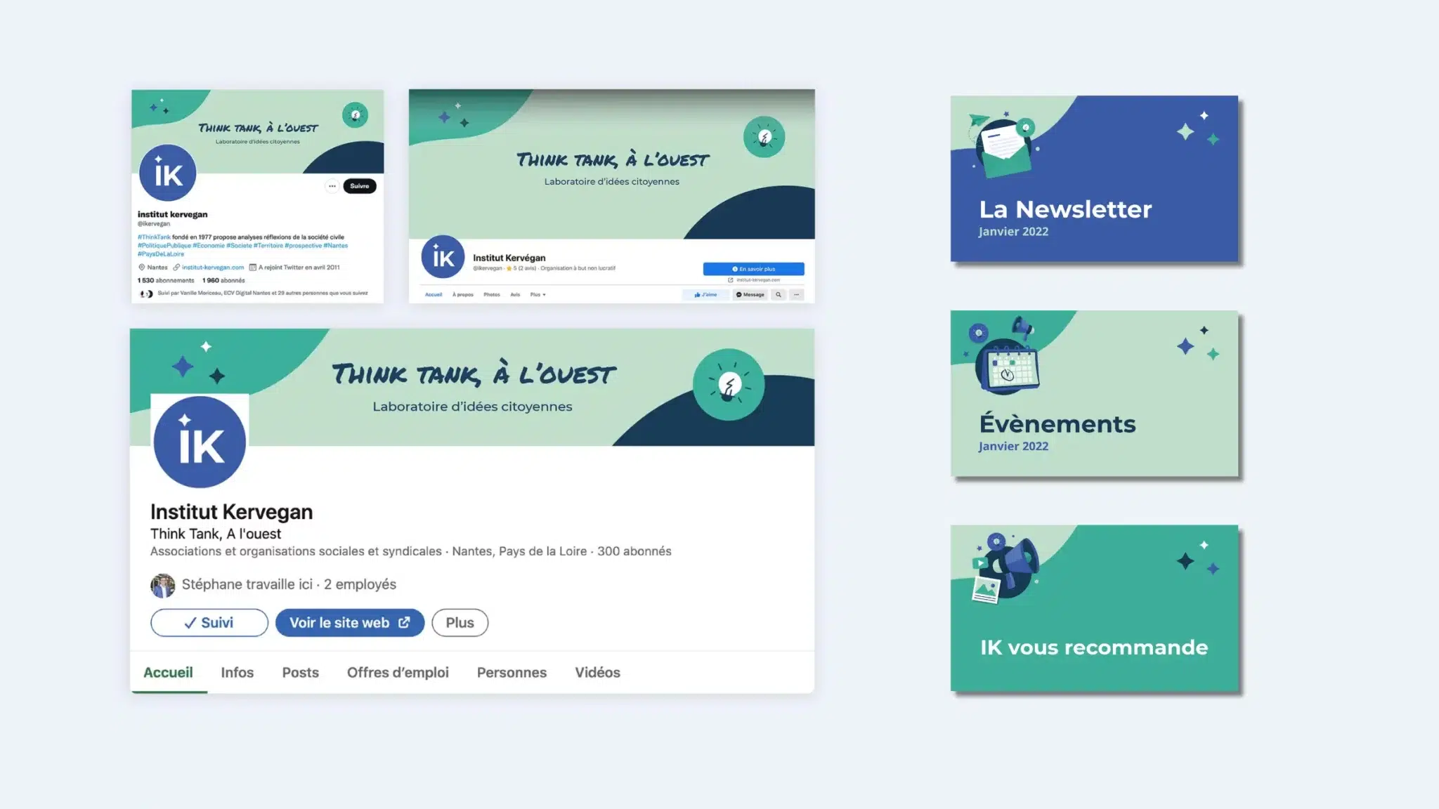 Pour affirmer sa présence digitale, des bannières et modèles de publications ont été créés pour LinkedIn, Facebook et Twitter. Ce kit permet de diffuser une communication claire et impactante, en cohérence avec la nouvelle charte graphique de l’Institut.