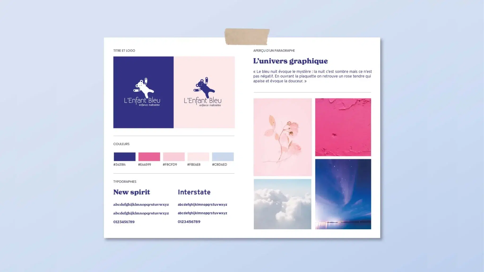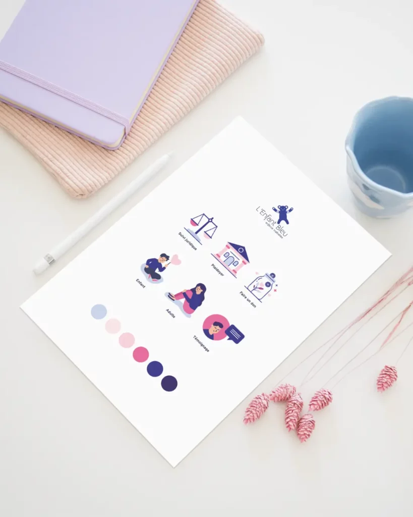 Chaque projet démarre par une réflexion approfondie autour de l’univers visuel à créer. Ici, l’objectif était de traduire la mission de l’association avec une identité douce et rassurante. Le bleu profond symbolise la protection, le rose tendre évoque la reconstruction, et l’ensemble transmet confiance et sérénité.