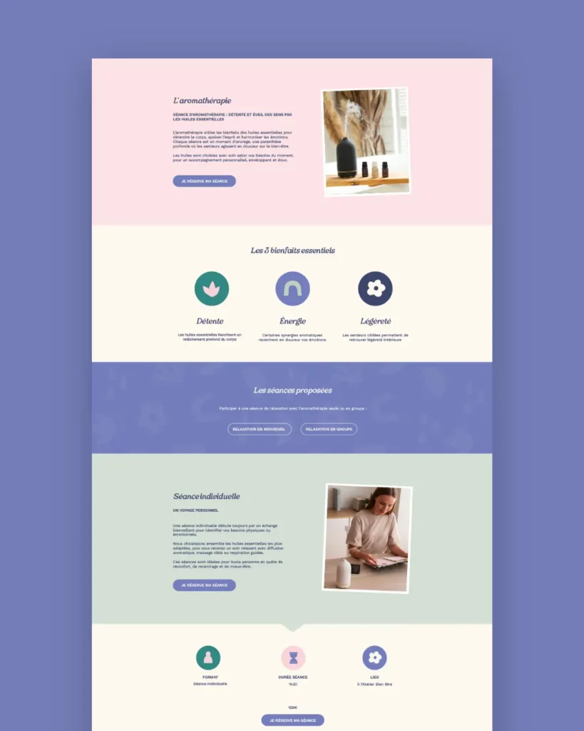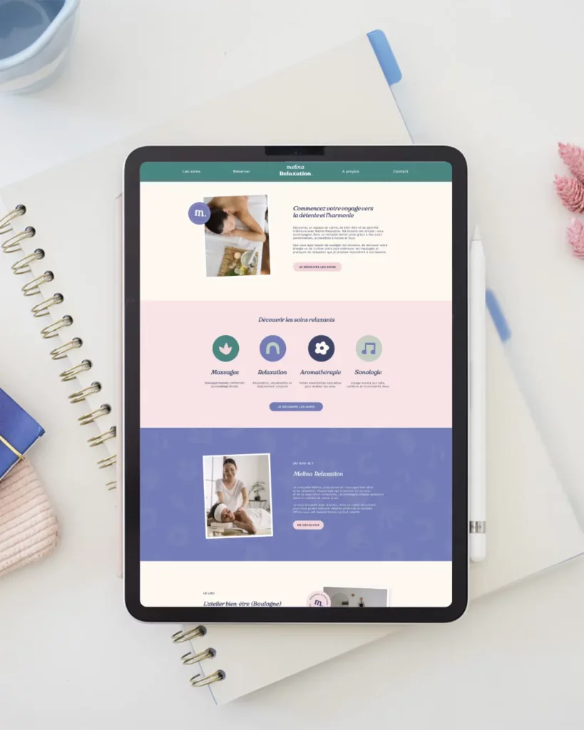 Mélina est praticienne en relaxation. Ensemble, nous avons créé une identité douce et sensorielle ainsi qu’un site web apaisant pour refléter pleinement son univers et faire connaître les soins qu’elle propose.