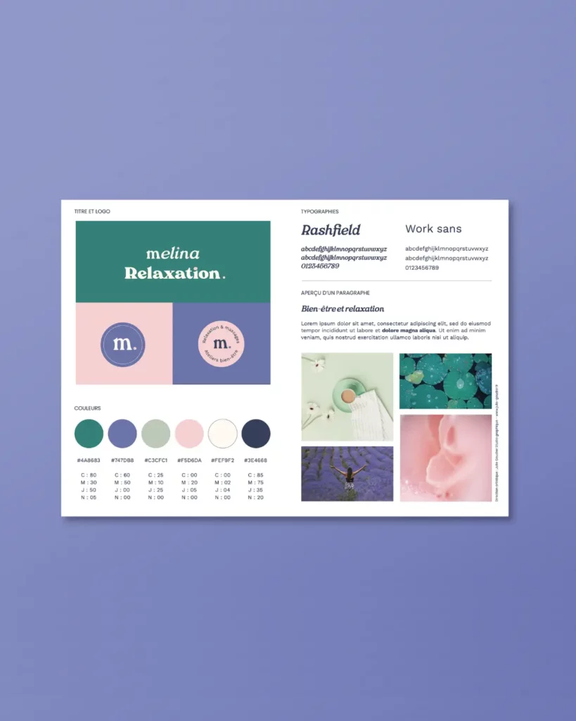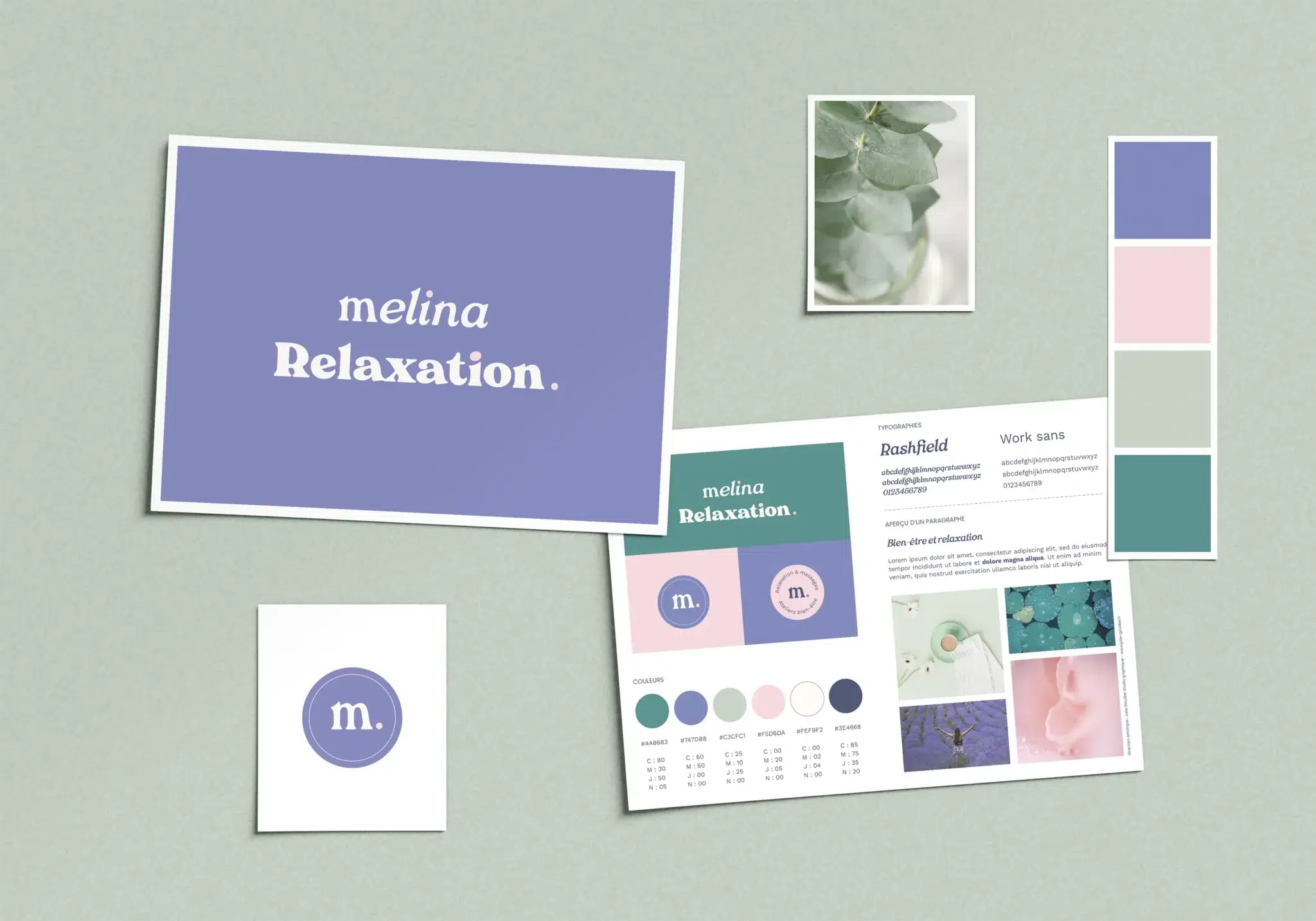 La planche de marque de Mélina associe des couleurs douces et naturelles à un logo épuré qui inspire sérénité et bien-être. Les typographies claires et subtiles renforcent l’harmonie de l’ensemble. Une identité apaisante et élégante, en phase avec l’univers de la relaxation.