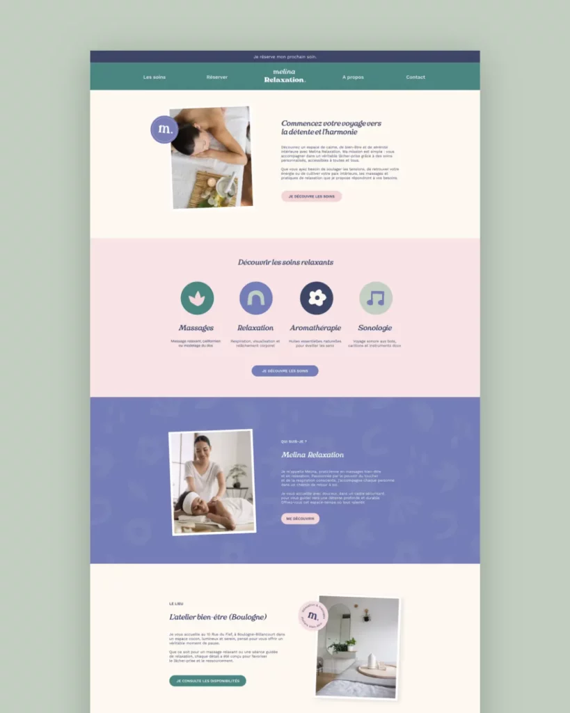 Le site de Mélina mise sur une navigation fluide, des visuels délicats et une mise en page lumineuse. Chaque détail respire la douceur et met en valeur les soins, avec un design épuré et professionnel.