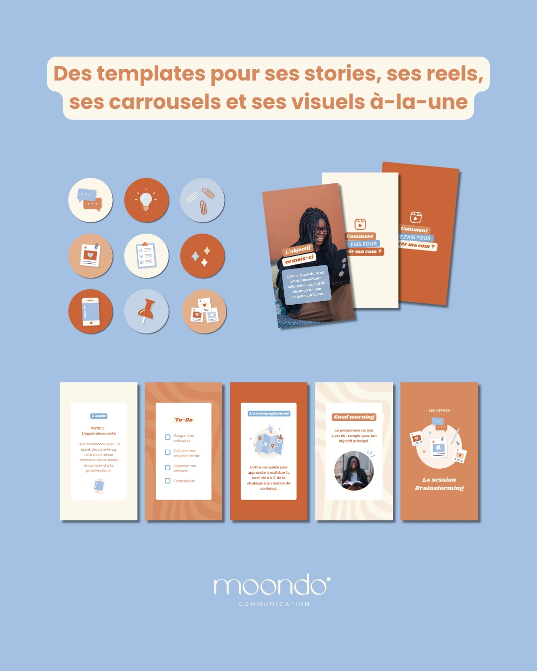 Nous avons ensuite créé un Kit Instagram complet, qui intègre ses illustrations : visuels de couverture pour les stories à la une, templates de posts, stories et reels. Cela lui permet d’assurer une communication fluide et cohérente sur Instagram.